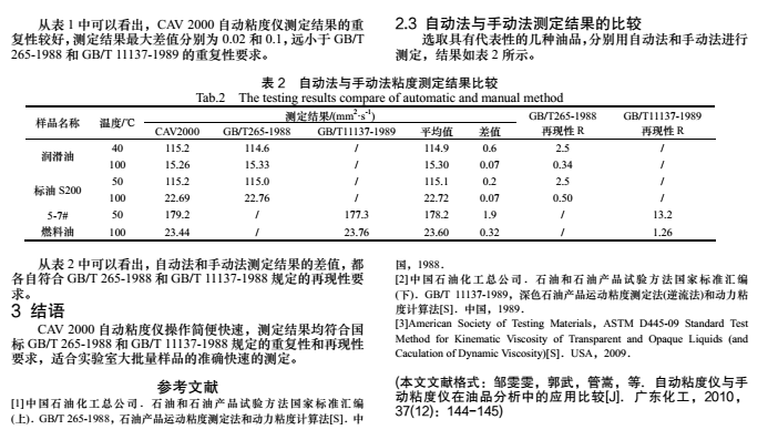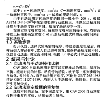[2](深色石油產(chǎn)品運(yùn)動粘度測定法(逆流法) 和動力粘度計算法),均采用手動法進(jìn)行測定,取樣及清洗工 作復(fù)雜,測定時間較長,不適合大批量樣品的準(zhǔn)確快速的測定。 而美G CANNON 公司生產(chǎn)的 CAV 2000 自動粘度儀操作簡便、 快速,測定結(jié)果精度高,用于實(shí)驗室檢測能極大提高檢測效率 和檢測的準(zhǔn)確度。 1 實(shí)驗部分 1.1 儀器 CAV 2000 自動粘度儀是一種具有寬粘度測量范圍的粘度 測量儀器,粘度范圍為:0.5~5000 cst/40 ℃,0.5~2000 cst/100 ℃,適用于透明及不透明液體運(yùn)動粘度的測定,包括原油、輕 重質(zhì)燃料油、潤滑油、柴油、添加劑、廢油等,能夠自行選擇 毛細(xì)管的測量范圍,恒溫浴溫度范圍為:20~150 ℃,并配有 雙溶劑清洗系統(tǒng)和烘干功能,能夠一次進(jìn)樣 26 個樣品進(jìn)行連 續(xù)測定。 1.2 工作原理 在 CAV 2000 自動粘度測定中,運(yùn)動粘度的計算基于以下 公式: